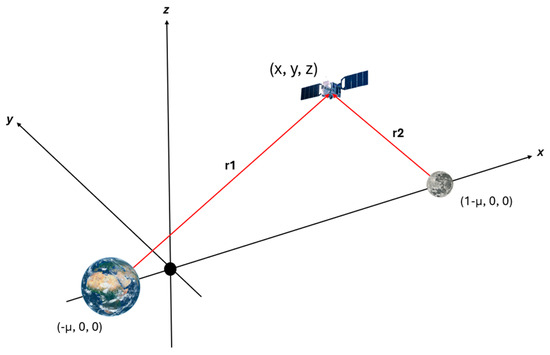 - The distance between m1 and m2 has their coordinates in the reference system as (−µ, 0, 0) and (1 − µ, 0, 0) on the x-axis, as viewable in Figure 3. In this way, the distances of the third body to m1 and m2 are given by the following: