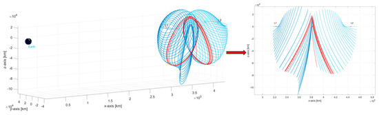 - Improvement of the preliminary simulation within the CR3BP moving to a more detailed analysis exploiting the Bicircular Restricted Four-Body Problem (BCR4BP) which considers the solar influence; this could surely enhance the stability analysis and enrich the library of initial state vectors for orbits around the Lagrange point of the Earth–Moon system.