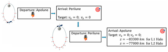 - Trofimov, S.; Shirobokov, M.; Tselousova, A.; Ovchinnikov, M. Transfers from near-rectilinear halo orbits to low-perilune orbits and the Moon’s surface. Acta Astronaut. 2020, 167, 260–271. [Google Scholar] [CrossRef]