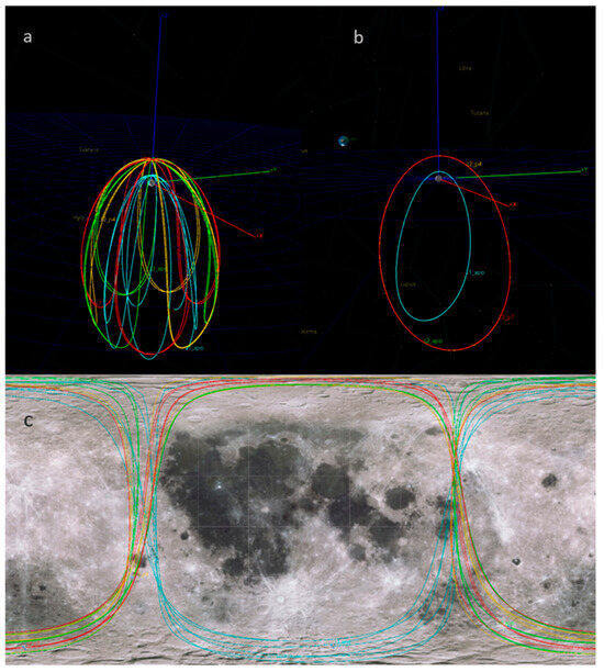 - Ely, T.A. Stable constellations of frozen elliptical inclined lunar orbits. J. Astronaut. Sci. 2005, 53, 301–316. [Google Scholar] [CrossRef]