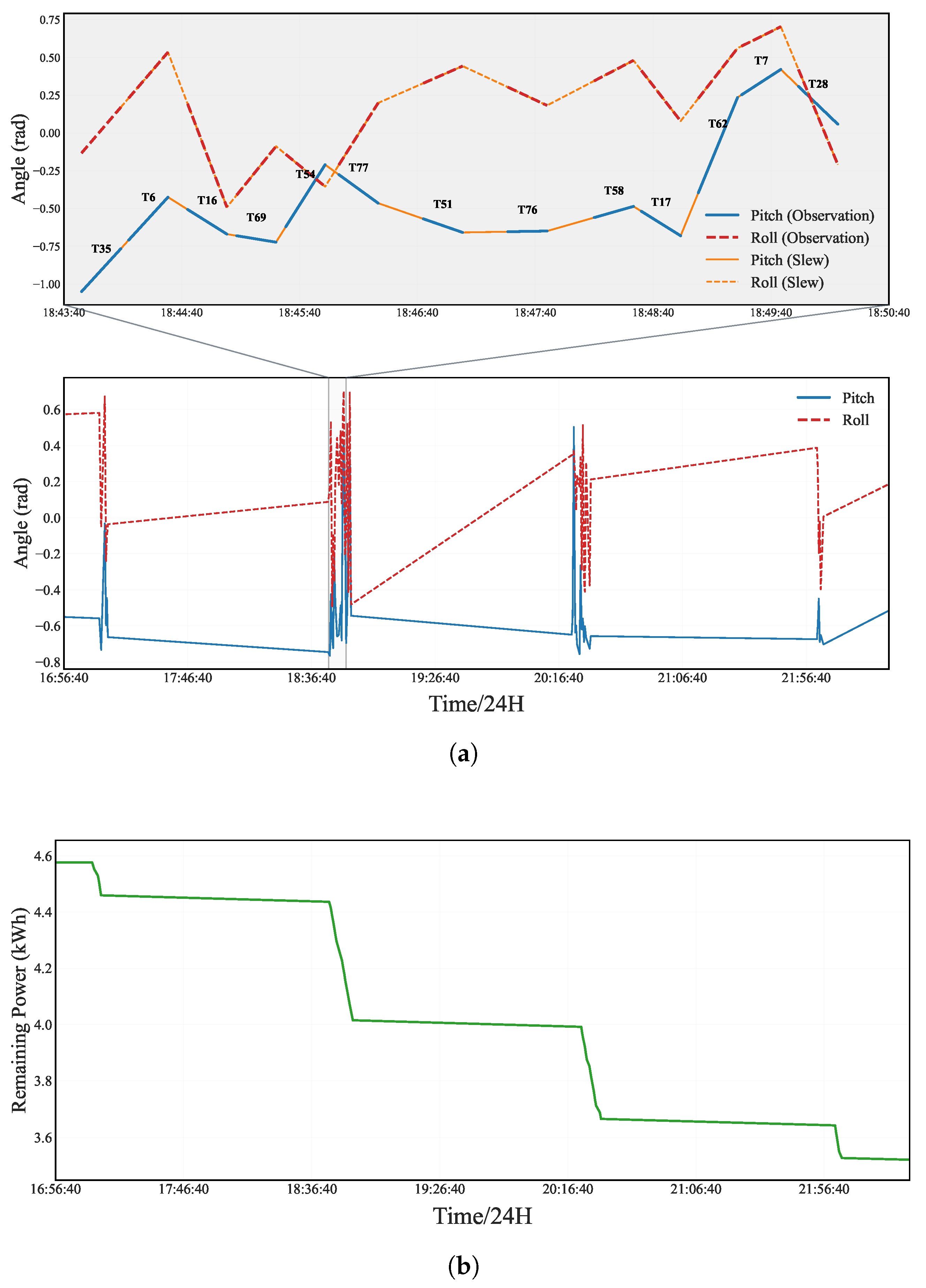 represent the roll and pitch angles, respectively. Let subscript nav denote the navigation-related variables for satellite maneuver characteristics. The short-term optimization objective function