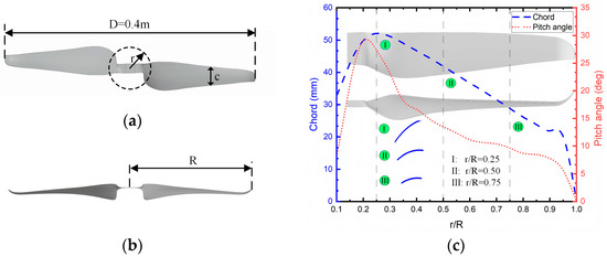 The 3D geometry of the propellers. (a) Top view; (b) front view; and (c) chord and pitch distribution.