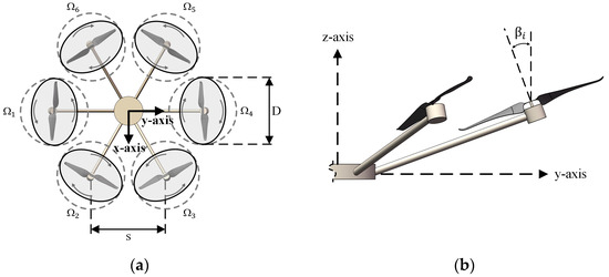 With the rapid development of the general aviation market, the application of multirotor unmanned aerial hexacopters (UAVs) is becoming increasingly widespread [1]. UAVs have unique capabilities, such as vertical takeoff and landing and stable hovering, which enable them to provide cost-effective solutions in the military, industrial, and civil sectors by carrying a variety of sensors on board [2,3,4,5]. The propellers of conventional multirotor UAVs are typically positioned within the same plane, and this configuration has been widely adopted due to its simple and compact structural design. However, conventional multirotor UAVs have an underactuated structure due to the coupling between horizontal translation and rotational dynamics. Compared with conventional multirotor UAVs, tilted multirotor UAVs are prominent in current research due to their overactuated characteristics [6,7,8]. Hexacopters with tilted-rotor configurations can perform transverse roll and yaw motions under horizontal states and thus possess higher flight accuracy, safety, and stability. Various designs of tilted multirotor UAVs have been proposed in the related literature [9]. These hexacopters are characterized by the fact that their rotors are no longer parallel to each other. The rotors can be tilted around a radial axis, called the tangential tilt angle (α), or around an axis perpendicular to the radial axis, called the dihedral angle (β).