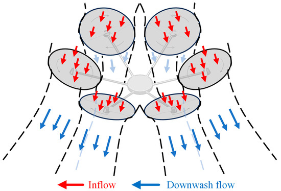Figure 4 shows the aerodynamic interference in an inner tilted-rotor hexacopter. Clearly, the aerodynamic interference between adjacent rotors varies with rotor spacings and dihedral angles. Both variables increase the complexity of the aerodynamic interference of the hexacopter since the inflow interacts with each other.