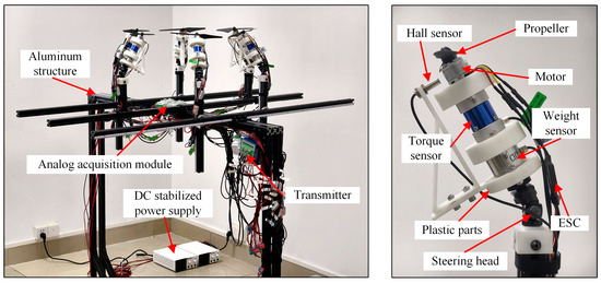 Figure 5 shows the experimental setup to measure the hovering performance of the inner tilted-rotor hexacopter. The test bench mainly consisted of a propeller unit, a data acquisition system, an electric power system, and a test frame. There are six groups of propeller units, including propellers, electronic speed controls (ESCs), and motors. The data acquisition system included thrust sensors, torque sensors, tachometer. The frame of the test bench is made of aluminum alloy. Different rotor spacings and dihedral angles of the hexacopter could be adjusted by changing the spacing between the support rods and the angle of the steering heads. To avoid airflow interference caused by ground effect as well as wall effect, the distance between the propeller and the ground was about 5D, and the distance between the test bench and the wall of the site was not less than 7D.