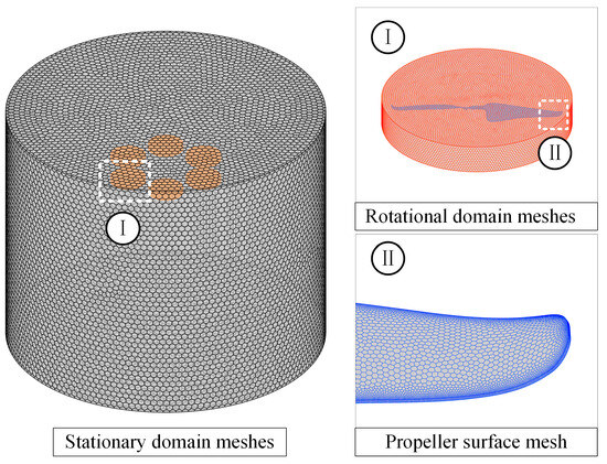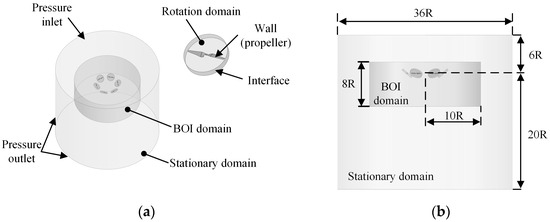 Figure 6 shows the computational domain and boundary conditions. The domain contains one stationary domain and six rotation domains, with each propeller corresponding to one rotation domain. To analyze the aerodynamic characteristics of the hexacopter with different rotor spacing and dihedral angle configurations more clearly, the components such as the fuselage and the arms were excluded from the analyses of the present simulation. In addition, to capture the details of the vortices generated by the propellers, a Body of Influence (BOI) domain was generated when the mesh was refined.
