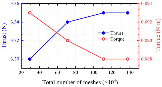To minimize the influence of the mesh size on computational accuracy and to improve the reliability of the simulation results, the mesh sensitivity of the isolated propeller as well as the hexacopter was investigated. Table 4 shows the number of meshes for four configurations and their simulation results. Figure 7 shows the variation of thrust and torque with different mesh numbers. It can be seen that the thrust increases with the number of meshes, whereas the torque decreases with it. In addition, the average y+ value for Mesh 3 is about 32, as recommended in [25], resulting in higher stability, and it is proven to be sufficient for computational accuracy.