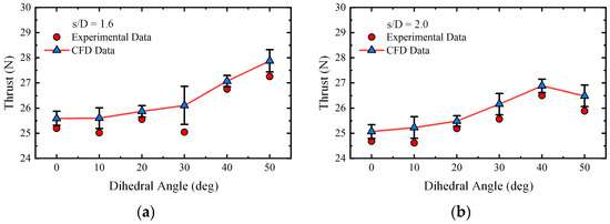 The validation of the CFD simulation calculations was combined with the experimental data. Figure 9 shows the comparison of the thrust. It can be seen that these are generally in good agreement, with errors of less than 10%.