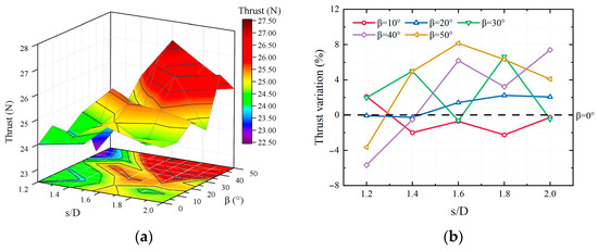 Figure 10 shows the thrust variation of the hexacopter. For a fixed rotor speed, the thrust in the conventional hexacopter shows a tendency to increase and then decrease with the increase in rotor spacings and reaches a maximum value near s/D = 1.6. For a smaller spacing, strong aerodynamic interference will lead to the loss of thrust. Furthermore, the aerodynamic interference is weakened with a higher spacing ratio, and the thrust decreases and tends to be stabilized, which indicates that the appropriate aerodynamic interference improves the performance of the novel hexacopter. Also, the thrust generated by the novel hexacopter is much improved when s/D = 1.6 and β = 50°, reaching a maximum value of 27.25 N, which is 8.15% higher and has a similar “face-to-face” layout [30]. Similarly, the hexacopter thrust reaches 26.75 N at s/D = 1.6 and β = 40°, which is 6.17% higher than that of the conventional hexacopter. It is also worth noting that the thrust reaches its minimum when the rotor spacings are small and the dihedral angle is large, which is due to the drastic aerodynamic disturbances caused by the smaller rotor spacings and the larger dihedral angles.