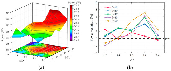 For the tilted rotor arrangement, there is a general increment. It reaches 7.22% at β = 50° with large rotor spacings resulting in significant energy consumption. In addition, the power reaches its minimum with smaller rotor spacings and larger dihedral angles. This is caused by unstable airflow with increased turbulence, and it thereby reduces rotor thrust. It is also worth noting that the power decreases at large rotor spacings. However, large rotor spacing increases the size of the frame, which will result in additional power consumption. As an optimal spacing, s/D between 1.4 and 1.6 with anangle β of less than 40° promoted better performance compared with the conventional hexacopter.