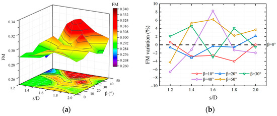 Figure 12 shows the FM of the hexacopter. To evaluate the hover efficiency, a high FM means that the propeller consumes less power with a given thrust. Smaller rotor spacings lead to increased airflow mutual interference and reduced rotor efficiency, resulting in increased energy consumption, reduced flight time, and poorer performance metrics [31]. Compared with the conventional hexacopter, the inner tilted-rotor hexacopter with a smaller dihedral angle does not show a significant advantage. The hexacopter obtains excellent performance at s/D = 1.6, β = 40°, where the FM reaches the highest value of 3.29, which is 8.26% higher than the conventional hexacopter, implying that the inner tilted-rotor hexacopter has much better performance in this arrangement.