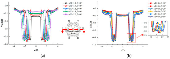The velocity distribution at 0.4D below the hexacopter. (a) β = 40° and s/D varying from 1.2 to 2.0; (b) s/D = 1.6 and β varying from 10° to 50°.