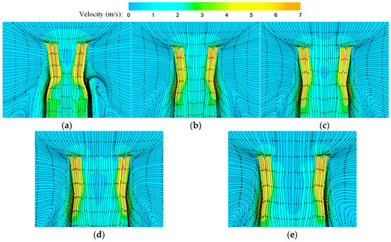Velocity and streamline distributions at β = 0° (Arrows represent the direction of streamlines). (a) s/D = 1.2; (b) s/D = 1.4; (c) s/D = 1.6; (d) s/D = 1.8; and (e) s/D = 2.0.