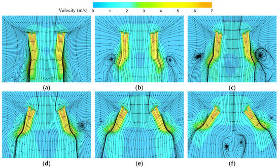 Velocity and streamline distribution of rotor cross-section for different dihedral angles at s/D = 1.6 (Arrows represent the direction of streamlines). (a) β = 0°; (b) β = 10°; (c) β = 20°; (d) β = 30°; (e) β = 40°; and (f) β = 50°.
