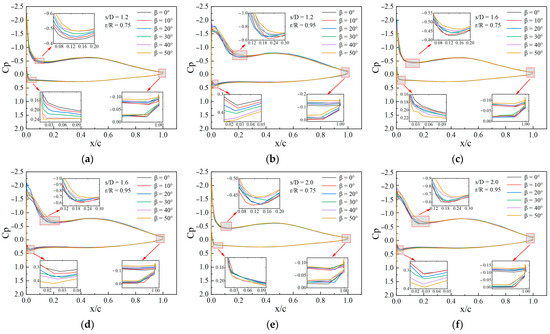 The pressure difference between the upper and lower surfaces near the tip of the rotor is the main source of rotor thrust. Also, the angle of attack is changed by the tilt of the propeller [37,38]. In general, the pressure for smaller angles is generally lower than that larger angles. However, the larger rotor spacing showed a smaller variation, especially at 0 ≤ x/c ≤ 0.2. In addition, the pressure difference is higher at x/c = 0.47, where the negative pressure on the upper surface of the blade shows a larger value. At 0.98 ≤ x/c ≤ 1.0, there is a clear negative pressure area with a larger internal angle and there is a lower negative pressure peak at r/R = 0.75 with s/D = 1.6, which may lead to airflow separation [39]. It is more clearly at r/R = 0.95, the negative pressure on the upper surface of the propeller is increased.