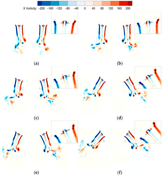 Vorticity distribution at s/D = 1.6. (a) β = 0°; (b) β = 10°; (c) β = 20°; (d) β = 30°; (e) β = 40°; and (f) β = 50°.