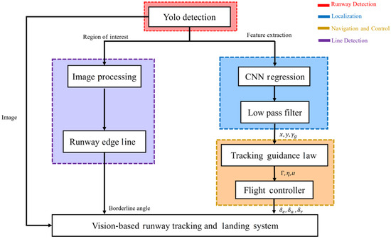 In this study, two deep learning models were mainly used as the approach for the runway visual landing system. To achieve real-time vision-based navigation in the simulation environment, a lightweight model of YOLOv8 was utilized for runway detection and localization. After detecting the runway, a CNN regression model was applied to determine the runway’s longitudinal distance, lateral distance, and glide slope angle. Image processing methods were applied to determine the angles of the two runway edge lines, providing a reference for checking whether the aircraft was aligned with the runway centerline. After obtaining the navigation information from image estimation, a low-pass filter was used to remove noise, and a guidance law was introduced to guide the aircraft along the desired glide path, whether it was directly aligned with or deviated from the runway. This system was implemented in the simulation environment X-Plane 11. Figure 1 shows the flowchart of this study, which includes runway detection, localization, line detection, and controller design.