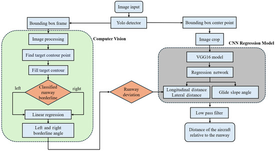 By obtaining object information through the previously mentioned object detection methods, a monocular camera can solve the relative coordinate positions of the UAV’s attitude and object information. In this context, multirotors often use ArUco marker [14] and Helipad [15] to determine the pose of the landmark itself and then calculate the camera’s position in space. However, this method is not feasible for runway landings due to its inability to identify markers for positioning. Therefore, other studies [16,17] proposed the Plücker method, which involves detecting runway lines, calculating their slopes, and determining the aircraft’s longitudinal displacement, lateral displacement, and altitude relative to the runway. This method is more suitable for situations where the complete runway contour is clearly visible at close range. However, it has limitations because the longitudinal displacement is sensitive to the runway’s bottom edge lines, leading to inaccurate estimates. Therefore, another study [18] proposed a CNN regression model to replace the longitudinal displacement and compared the contour positioning solutions of different detection methods. In addition, the pinhole model and Perspective-n-Point (PnP) were used for camera optical positioning and solving positions [19]. In recent studies, deep learning models have been used to directly train estimated displacements, angles, and other parameters without considering complex calculations. One study [20] employed end-to-end learning to train the UAV’s relative heading angle to the runway in case of sensor failure. However, due to insufficient data collection, the fixed-wing UAV became uncontrollable during the final approach. In our previous work [18], cropped images were used to detect an approaching intruder by YOLOv3, and a CNN regression model was applied to determine the target UAV’s distance. Although many studies have proposed various positioning solutions, most experimental methods are based on simulated videos, with fewer utilizing optical positioning solutions or deep learning to estimate distances and provide guidance for UAV flight.
