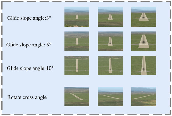 Based on the concepts of the ILS’s glide slope and localizer, additional datasets are needed to train the regression model to obtain the distance to the runway from different angles. By collecting data from specified locations in X-Plane 11, a total of approximately 15,000 images were gathered. Using the trained YOLOv8 model, a 200 × 200 pixel area extending outward from the bounding box center was used as the dataset. The data collection method involved calculating the deviation angle to determine specific position points and obtaining the aircraft’s relative distance to the runway for annotation. The information on data collection is shown in Table 1. The applicable range of this study enables effective runway distance and angle estimation within a 10-degree lateral deviation and a 10-degree longitudinal deviation from the runway. Figure 4 shows the cropped images from different angles.