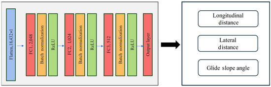 The backbone model adopted in this study is the VGG16 model. The pre-trained weights used are from ImageNet for subsequent transfer learning applications. As shown in Figure 5, the architecture of the regression network consists of three fully connected layers. The output value provides the required longitudinal distance, lateral distance, and glide slope angle.