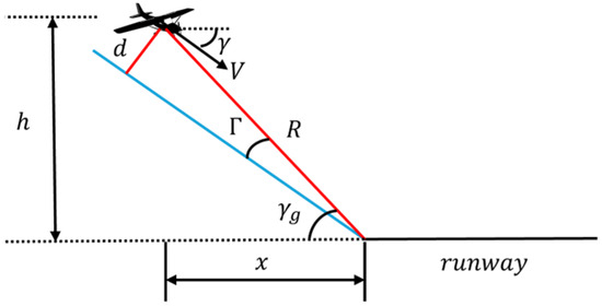 During the glide phase of the landing process, glide slope guidance can provide the aircraft with distance error relative to the runway [27]. When the aircraft deviates from the glide slope, there is a vertical distance, , between the aircraft’s center of gravity and the glide slope. By knowing the aircraft’s forward speed and flight path angle, the change of the deviation from the glide slope, , can be determined. The hypotenuse distance of the glide slope, , can be calculated from the aircraft’s longitudinal distance and altitude. These values yield the aircraft’s current deviation angle, , from the glide slope, with the objective being to eliminate the deviation error, as shown in Figure 9.