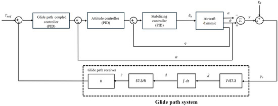 By setting the reference path angle and the path deviation angle, the error can be input into the position controller, referred to as the Glide Path Coupled controller. A PID controller is used, and the error obtained from this controller is then passed to the autopilot’s attitude controller and stability augmentation controller to determine the elevator command angle. The longitudinal control architecture is shown in Figure 10.