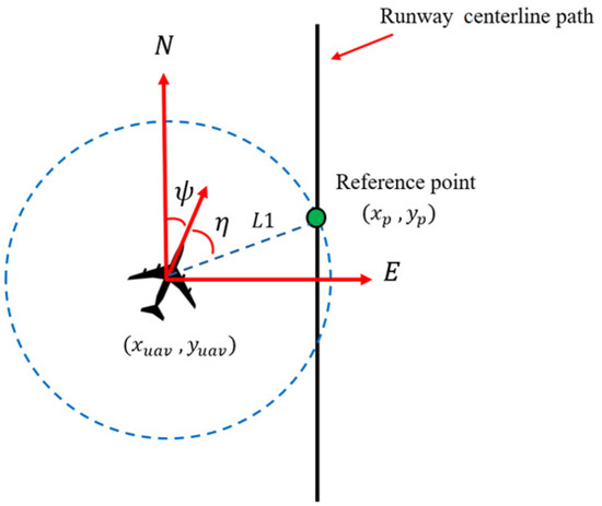 In addition to longitudinal landing control, ensuring that the aircraft can stably fly along the runway centerline is crucial. The path-following guidance law in study [26] is adopted, which enables fixed-wing aircraft to follow a straight flight path. The reference points on the path are determined by the L1 distance. A circle with a radius equal to the L1 distance is drawn with the UAV’s position as the origin. This circle intersects the linear equation at two reference points, and the point closest to the UAV’s heading is designated as the target point, as shown in Figure 11.