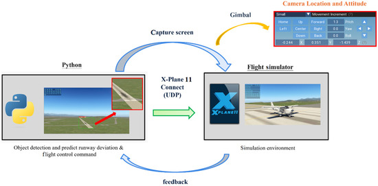 X-Plane 11 Flight Simulator was adopted in this study as the simulation environment, and the aircraft chosen for the simulation was the Cessna 172 Skyhawk, representing a fixed-wing UAV. The X-Plane 11 Connect Toolbox was employed to send control commands via UDP to control the aircraft. Figure 13 shows the real-time system software-in-the-loop simulation. To prevent image instability caused by aircraft movements, a gimbal system was used to keep the camera level and stable. The simulations were conducted at the recommended landing speed of 45 m/s for Cessna 172 aircraft.