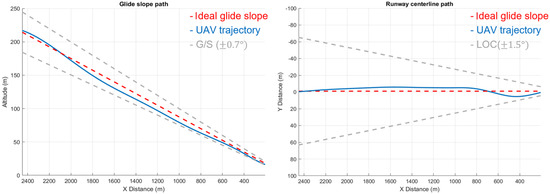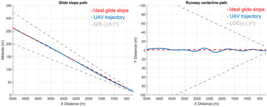 Case 1 describes a scenario where the aircraft is directly facing the runway, starting from 5 km. The image detection and regression model information are used as guidance for the UAV to perform a 3-degree glide slope landing. Figure 14 shows the longitudinal and lateral tracking results. To observe whether the flight trajectory falls within the recommended ILS range, this study uses a glide slope (G/S) tolerance of 0.7 degrees and a localizer (LOC) tolerance of 1.5 degrees as the target ranges.