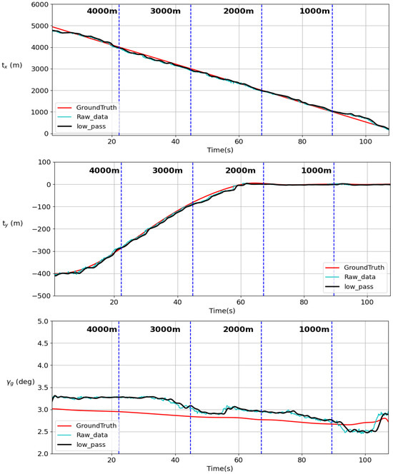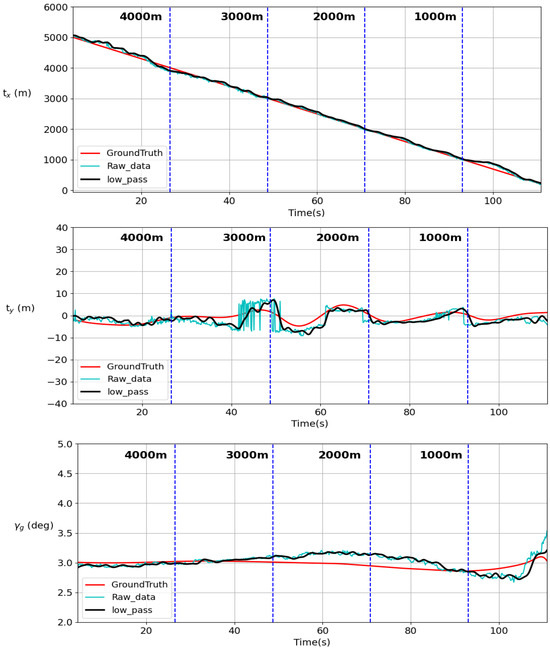 In Case 3, a glide slope landing is conducted with the UAV directly facing the runway and aligned with the runway centerline, assessing whether a 3-degree glide slope can be applied for landing at greater angles. This evaluates the ability of the regression model to accurately predict positions with different runway profiles at closer ranges. Figure 22 shows the longitudinal and lateral tracking results. In the longitudinal tracking, it can be observed that flight path errors are more significant than the errors in Case 2. Although the aircraft deviates from the glide path in this scenario, the trend eventually slowly returns to the 5-degree glide path. Figure 23 shows the responses of the automatic landing system. Figure 24 shows the estimation results compared to the ground truth.
