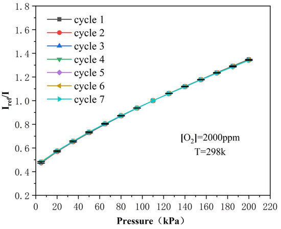 Prior to the calibration experiments, we conducted a systematic evaluation of the combined error of the calibration system. The calibration samples on the sixth day after spraying were placed in the calibration chamber with the oxygen concentration set at 2000 ppm and the temperature at 298 K. Seven sets of pressure response curves were obtained by repeatedly adjusting the pressure from 5 kPa to 200 kPa for seven cycles. The integrated error of the calibration system was systematically evaluated by solving the twofold standard deviation of the repeatable pressure response curves and plotting the corresponding error bars. The repeatability curves for the seven cycles are shown in Figure 2. The error of the system is within 0.5% in all the regions except 0.68% at 5 kPa, and the fluctuation is small.