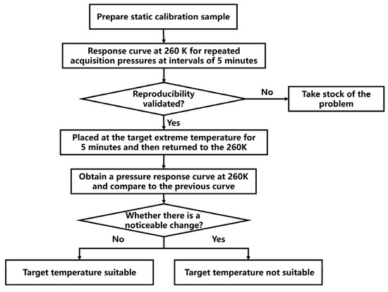In cryogenic wind tunnel tests, PSP is typically used in a broad temperature range, with the total temperature of the free stream ranging from lower than 120 K to approximately 323 K. To verify the applicability of the self-developed PSP coating in cryogenic wind tunnels and determine whether the paint undergoes irreversible changes in coating properties at extreme temperatures, this paper proposes a PSP stable temperature range based on the cryogenic PSP static calibration system. The evaluation procedure is as follows: (1) Prepare a static calibration sample using the paint formulation and spraying process mentioned in Section 2.1. (2) Obtain the pressure response curve using the static calibration system at room temperature or a moderate temperature. After an interval of five minutes, obtain the curves again at this temperature with the same procedure and compare them to ensure stability at the current temperature. (3) Adjust the sample temperature from the moderate temperature to the target extreme temperature and hold for five minutes. The sample temperature is then lowered and returned to a moderate temperature. (4) Recalibrate the pressure curve under moderate temperature. (5) Compare the pressure response curves before and after extreme temperature impingement to determine whether the paint undergoes irreversible changes in coating properties. If a significant change is observed, it indicates that the target extreme temperature causes structural damage to the cryogenic PSP coating, demonstrating that the designed cryogenic PSP is not suitable for this target temperature. The flowchart of this determination method is shown in Figure 3.