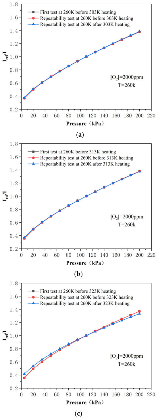 (a) Pressure response curves at 260 K before and after 303 K heating; (b) pressure response curves at 260 K before and after 313 K heating; (c) pressure response curves at 260 K before and after 323 K heating.