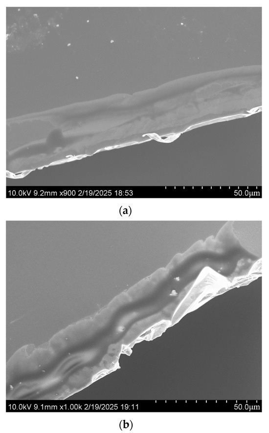 To investigate the cause, scanning electron microscope (SEM) observations were conducted on the cross-sectional morphology of the coating before and after extreme temperature impingement, as shown in Figure 5. It is worth noting that the samples we used for SEM characterization were pure PTMSP coatings and not surface-sprayed PtTFPP. The results indicate that the coating cross-section exhibits signs of thermal deformation to some extent after heating [23]. The experimental findings suggest that the microstructure of the coating undergoes changes at this temperature. This phenomenon may be attributed to the accelerated aging of the polymer’s porous structure of the cryogenic PSP coating at 323 K, which reduces the oxygen permeability rate and leads to a significant decrease in pressure sensitivity. Using the aforementioned PSP applicability temperature evaluation method, the self-developed cryogenic PSP is verified as suitable for temperatures from room temperature down to 123 K.