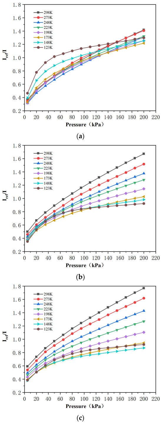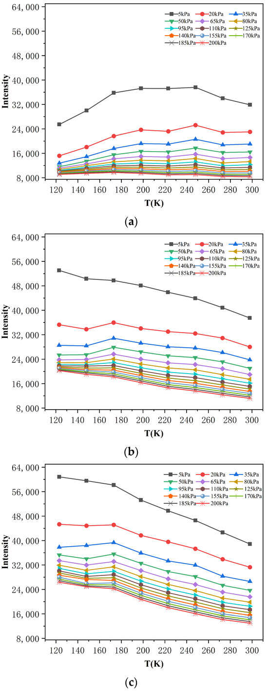 In order to better evaluate and reduce pressure measurement errors caused by temperature effects, we measured the luminescence characteristics of coatings at different temperatures and pressures and analyzed their patterns. This provides a reference for interpreting cryogenic PSP pressure measurement results and developing temperature effect correction methods. Figure 6 shows the variation in luminescence intensity with temperature at different sample storage times and under different pressure conditions. As the temperature decreases from 298 K to 123 K, the thermal quenching effect weakens, and the luminescence intensity of the coating gradually increases. This trend is consistent with that of conventional PSP. As the temperature decreases below 248 K, the luminescence intensity of the coating exhibits an inverse relationship with conventional PSP behavior. As the temperature decreases during a certain cryogenic temperature range, the luminescence intensity of the coating gradually weakens. Repeated calibration experiments confirmed this anomalous trend.