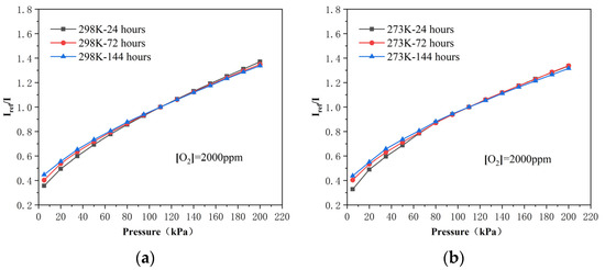 Pressure sensitivity is a key parameter in evaluating the characteristics of cryogenic PSP coatings. Figure 4 presents the pressure response curves of the self-developed cryogenic PSP coating at different temperatures. The data are plotted with 223 K and 110 kPa as the reference state. As shown in Figure 7a, on the first day after spraying, as the temperature decreases from 298 K to 123 K, the oxygen permeability rate of the polymer gradually decreases, leading to a gradual reduction in overall pressure sensitivity. However, in general, the changes in oxygen permeability rate and pressure sensitivity remain relatively small. Notably, an abnormal increase in pressure sensitivity is observed in the low-pressure region at 148 K and 123 K. This phenomenon may be attributed to the prolonged fluorescence lifetime of PtTFPP at low temperatures, which extends the oxygen quenching time window. Additionally, the increase in free volume fraction at low pressures counteracts the material contraction caused by temperature reduction, resulting in an unexpectedly high sensitivity in the low-pressure region. Over time, crosslinking between molecular chains within the coating becomes more complete, leading to a gradual attenuation of this abnormal sensitivity effect, which stabilizes by the 144 h, as shown in Figure 7b,c. This discovery provides valuable insights for enhancing the pressure sensitivity of the cryogenic PSP, offering potential strategies for further optimization.