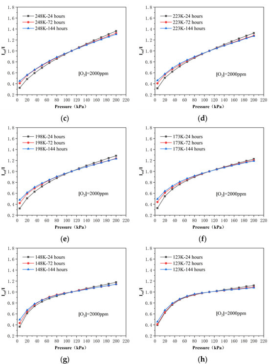 Comparison of pressure sensitivity at different temperatures over time: (a) 298 K; (b) 273 K; (c) 248 K; (d) 223 K; (e) 198 K; (f) 173 K; (g) 148 K; (h) 123 K.