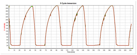 The liquid hydrogen (LH2) immersions were performed in a pressurized LH2 cryostat, ensuring adequate time for both the cooling and heating of the samples. The duration required for this procedure was determined based on the existing literature. Numerous research articles and laboratory reports have demonstrated that 3 min is sufficient to cool specimens of approximately 2 mm thickness from 293 K to 77 K [10,12,16,18]. In this study, once the measured temperature reached 20 K (the temperature of liquid hydrogen in this study), a hold time of 20 min was selected to ensure proper cooling. Figure 2 presents the temperature readings from thermocouples inside the cryostat.