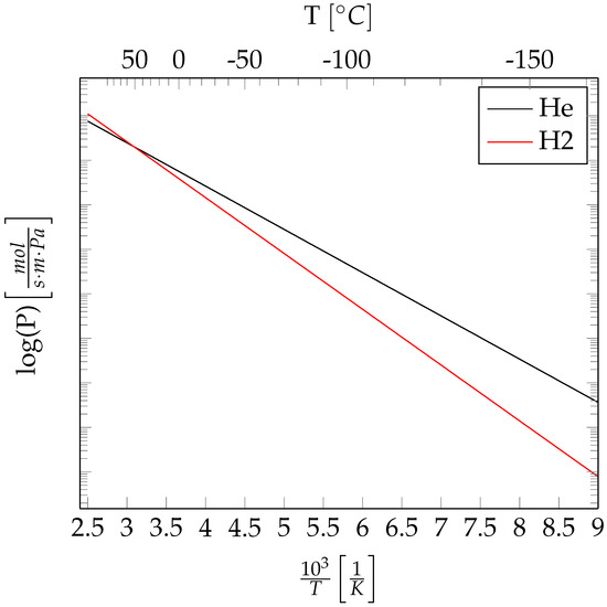 where and are the activation energies for both diffusion and solution processes, respectively. It has also been proven that the solubility of helium and hydrogen is generally stable with respect to temperature variations [30]; is found to be always positive; therefore, the diffusion coefficient always increases with temperature. From this, permeation can be expected to increase with increasing temperatures and conversely decrease with decreasing temperatures. Using available data in the literature, it is possible to prove with simulations that helium provides a conservative, valid estimation of hydrogen permeation, and that is owing to both the higher hydrogen permeation activation energy as well as hydrogen’s higher pre-exponential factor of the Arrhenius-type equation [8,30].