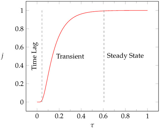 Theoretical Fick’s diffusion curve displayed as normalized flux vs. dimensionless time. The time-lag, transient state, and steady state sections of the curve are indicated.