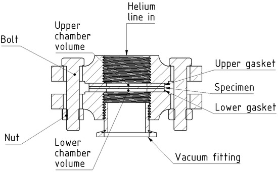 The test apparatus is schematically represented in Figure 5, where the principal components of the system are depicted. A gas cylinder is connected to the sample holder assembly (Figure 6) where the CFRP specimen is secured with fluoro-polymer gaskets in between stainless steel flanges. The same section of instrumentation tubing is also connected to an evacuation system that allows for performing several evacuation cycles. These evacuation cycles ensure as little air molecules as possible are left within the tubing assembly prior to tracer gas pressure application. With the evacuation cycles, a near-100% concentration of the tracer gas is ensured inside the upper chamber of the sample holder at the start of the testing procedure. Once the tracer gas permeates through the CFRP specimen, it is detected in the evacuated bottom chamber by the ASM340 Leak Detector instrument sourced from Pfeiffer-Vacuum’s Slovenian redistributor, connected to it. The instrument records the rate at which tracer gas molecules reach its measuring chamber through a mass spectrometer inner cell, and it outputs a leak rate value in units.