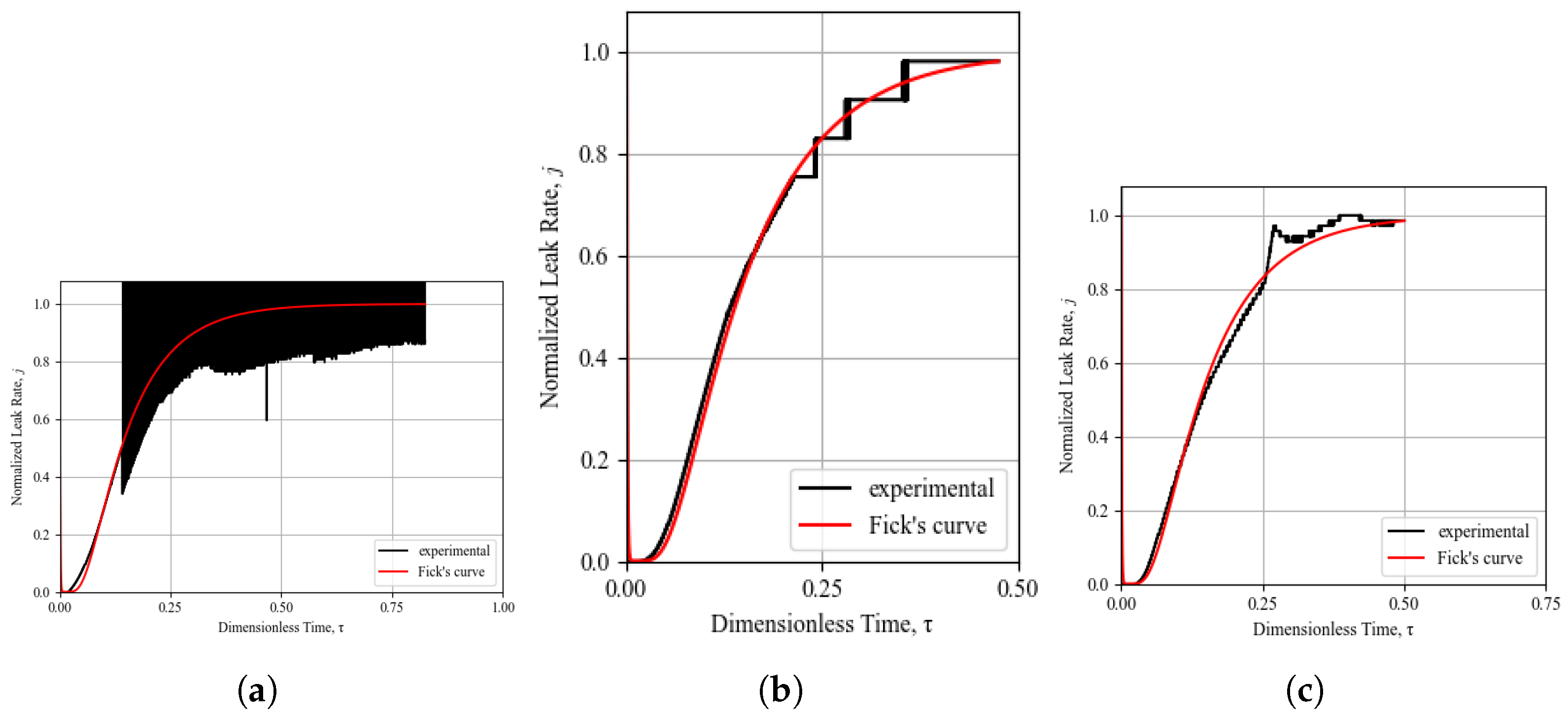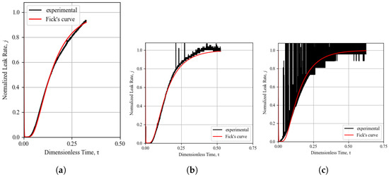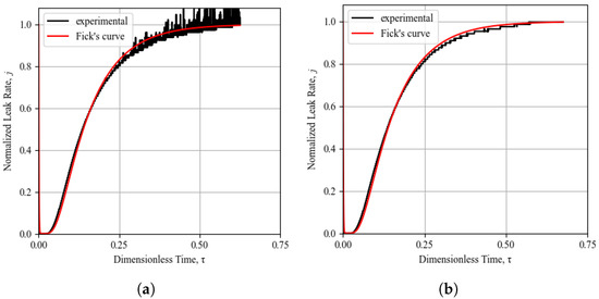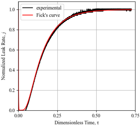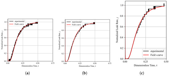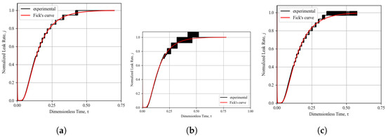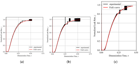 In this study, the leak rate of every sample was measured and its Fickian behavior was identified by fitting Fick’s normalized diffusion curve (calculated by as outlined in Section 3.2, Equation (17)) to normalized experimental result curves. A further quantification of the offset between theoretical Fickian behavior and the experimental result was investigated by means of the coefficient of determination . However, because of the frequent inconsistencies found in the recorded experimental leak tests, it was apparent that this coefficient was not easily implemented to compare results, and subjective judgment was always required to integrate the coefficient of determination indication. The subjective judgment of the Fickian curve fitting is based on the observation of good agreement or deviations in the three separate sections of the diffusion curve shown in Figure 4, namely the time lag, transient state, and steady state sections of the curve. It was identified that on multiple occasions, the subjective judgment of the curve fitting led to a Fickian behavior assessment while the calculated coefficient was in disagreement with the subjective conclusion. An example of this phenomenon is demonstrated by the experimental result shown in Figure 7, where the coefficient of determination is calculated to be 0.86 while the subjective assessment of the curve fitting to Fickian theory assigns a perfect Fickian behavior.The most easily detectable disagreement between the experiments and the theoretical diffusion is observed as the lack or reduction in the time lag, an identification method similarly used by [18]. The most common deviation identified in this study was a reduction in the time lag, coupled with a slower rise in the leak rate in the transient section of the curve, which can be verified by an analysis of the curves in Figure 8, Figure 9, Figure 10, Figure 11, Figure 12 and Figure 13.