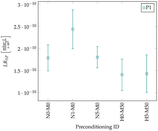 The results show how there is no significant change in leak rate between all tested specimens of the P1 material. A minor reduction in specific leak rate was identified for preconditioning types H0-M50 and H5-M50 when compared to N0-M0. A minor increase in specific leak rate was identified for preconditioning type N1-M0 when compared to N0-M0.