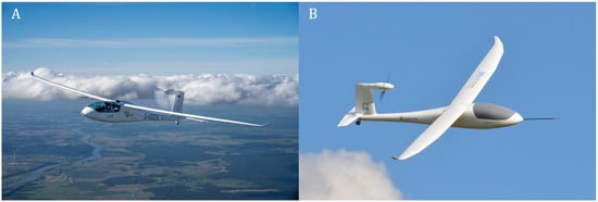 The e-Genius-Mod is a modular free-flight test platform, which is a 1:3 scaled model of the e-Genius, an all-electric motor glider []. Both aircraft were designed and manufactured at the IFB and are valuable tools for in-flight research. A side-by-side comparison of both aircraft is shown in Figure 2. In accordance with the recent trend in SFD testing, which is described in the previous subsection, the e-Genius-Mod is a demonstrative scaled model. This was achieved by conducting the scaling in compliance with the Froude number []. The resulting dimensions of the e-Genius-Mod are listed in Table 2.