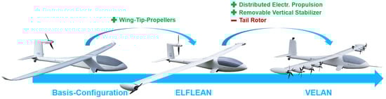 Since the finalization of the manufacturing process, the e-Genius-Mod has conducted a wide range of research flights. After examining the performance of the base configuration [], wingtip propellers were installed to interact with the wingtip vortexes as part of the research project ELFLEAN (“Elektrische Flächenendantriebe zur Entwicklung energieeffizienter und leiser Flugzeuge”), an electric wingtip propulsion system for the development of energy-efficient and noise-reduced airplanes. Among other results, a reduction in aerodynamic drag was shown when using the propellers in a tractor configuration rotating opposite to the vortexes []. As the next step, the tail rotor was removed and replaced by a total of eight propellers, distributed over the wing. The goal of the resulting research project VELAN (“Verteilte elektrische Antriebe”), regarding distributed electric propulsion, is to investigate the interdisciplinary influence of distributed electric propulsion (DEP). Although the project is still ongoing at the time of publication, the follow-up project eMission has been approved, in which further modifications will be made in terms of aerodynamics, propulsion, and flight dynamics. The evolution of the e-Genius-Mod from its original configuration to the VELAN configuration is shown in Figure 3.