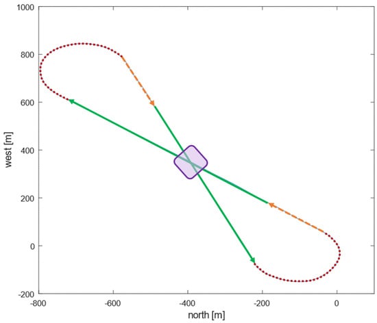 The planned flight path is displayed in Figure 4 and has already been used during previous flight campaigns [,]. It is flown by the onboard autopilot, commanding both airspeed and altitude to preset values. Advantageous features of this flight path are its long, straight tracks and the intersection in the center. This intersection lies within the measurement area of the ground-based LIDAR systems (purple square), enabling two passages of the e-Genius-Mod during one revolution.