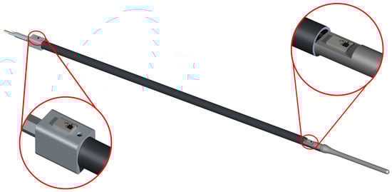 Rendering of the Vectoflow GmbH MHP with attached IMUs. The positions of both IMUs are marked by the red circles. The actual IMU at the probe’s tip is enclosed by the carbon tube.