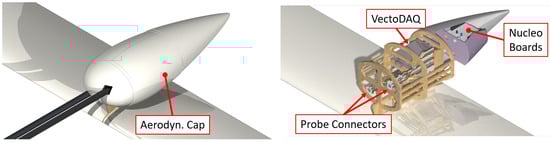 Inside the aerodynamic cap, both the VectoDAQ and the Nucleo boards for the IMUs are mounted onto the structure on top of the rib adapter. The power and data cables for the measurement systems run through the inside of the wing into the fuselage. The placement of the system on the e-Genius-Mod is shown in Figure 10. The architecture of the power and data system is laid out in Section 2.3.3.