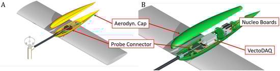 The probe configuration consists of a rib adapter, an aerodynamic cap consisting of four individual parts, and two probe connectors, in which the probes are attached to the wing adapter. The rib adapter (Figure 8A) is composed of aircraft plywood, the probe connectors consist of steel, and the aerodynamic cap was manufactured by selective laser sintering (SLS). The selected material is PA2201, a polyamid-12 powder suitable for SLS printing. The aerodynamic cap is based on an NACA0028 profile, and its width is expanded to enclose the inner structure. The final probe configuration is displayed in Figure 9.