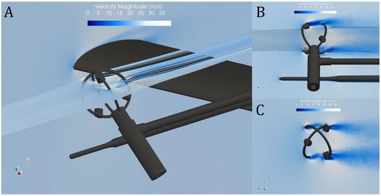 The top view in Figure 15C highlights wake regions downstream of the UA sensor. These wake zones are confined and narrow, with gradual velocity decay downstream, suggesting minimal drag effects introduced by the UA assembly. The smooth alignment of streamlines in this view further emphasizes that the flow around the MHP and UA remains undisturbed, ensuring reliable data acquisition.